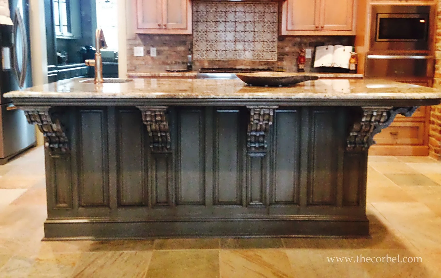 Side view, island 2012 2012, created a template for the butcher block 2012. A terrible paint job! 2012. After demo 2012 Kitchen before, you can see we had a "plan" Kitchen island, before 2013 1st "reveal" with new barstools 3 years later Corbels + beadboard added on island Installing floor + new beadboard Find 100s of Decorative Corbel Styles To Choose From. Shop Now! photos. kitchens. Kitchen Island with French Corbels. ... Backless metal kitchen counter stools sit at a brown kitchen island complemented with brass trim and topped with a white quartz waterfall countertop finished with a stainless steel